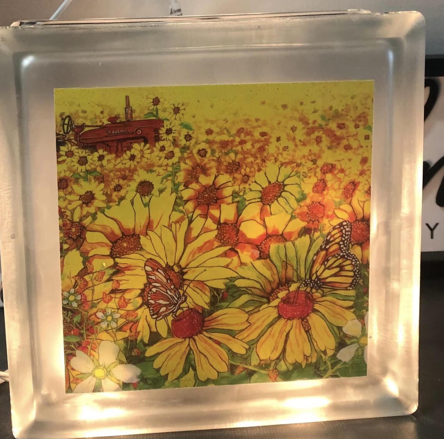 glass cube sunflowers